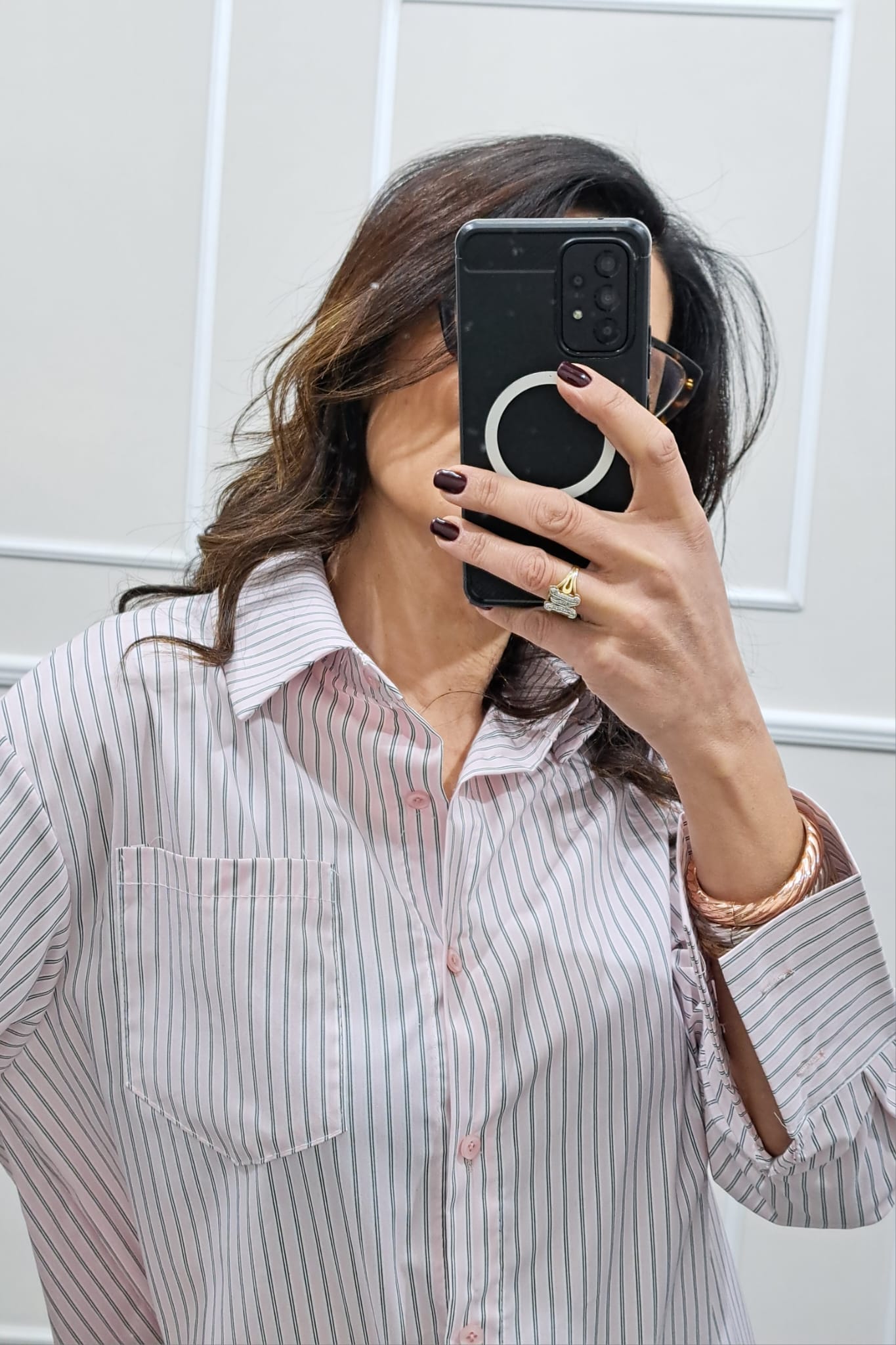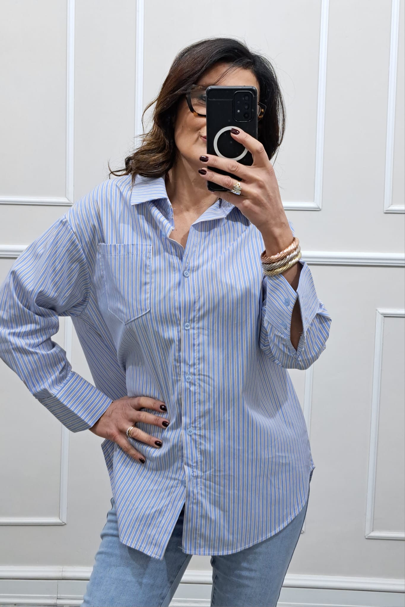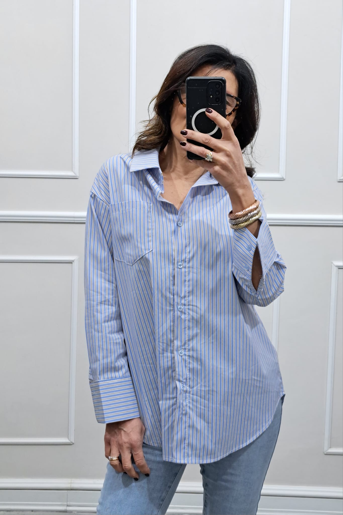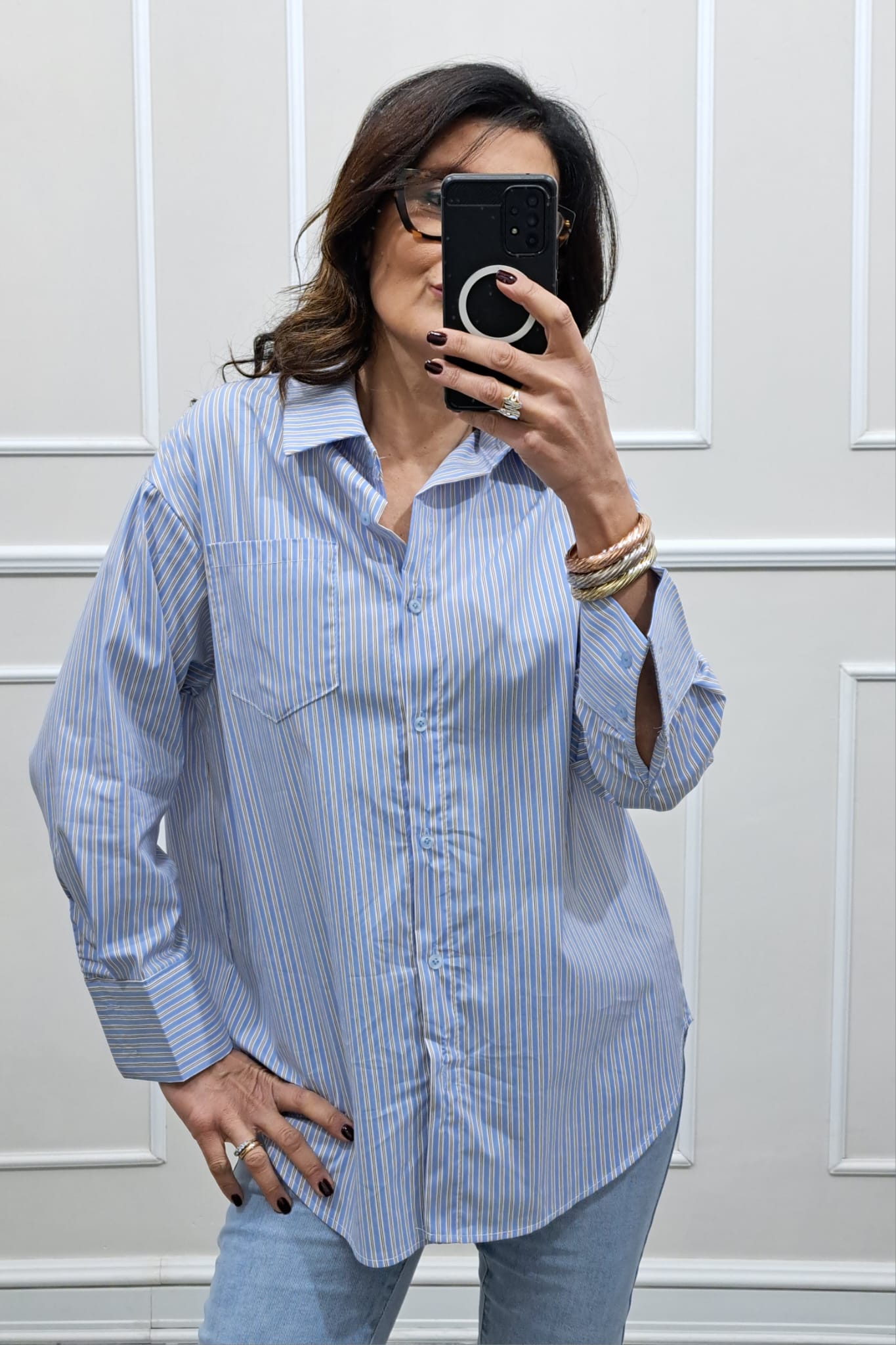 Camicia lunga a righe linea leggera over ,taschino ,la modella è alta 170cm ,la tg è unica e veste fino ad una 48