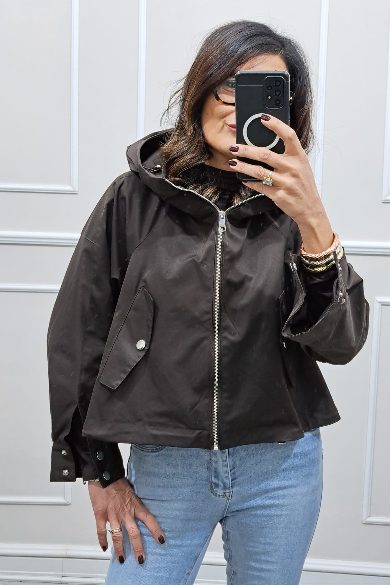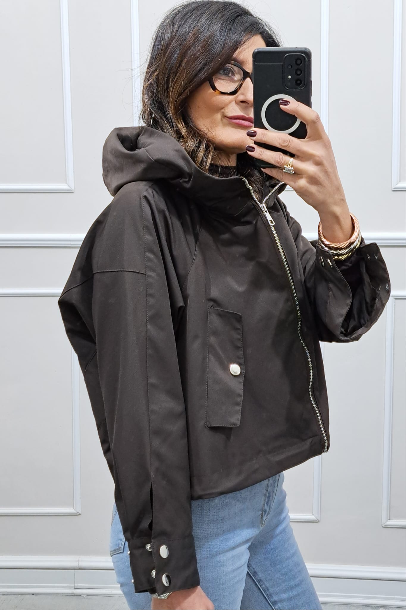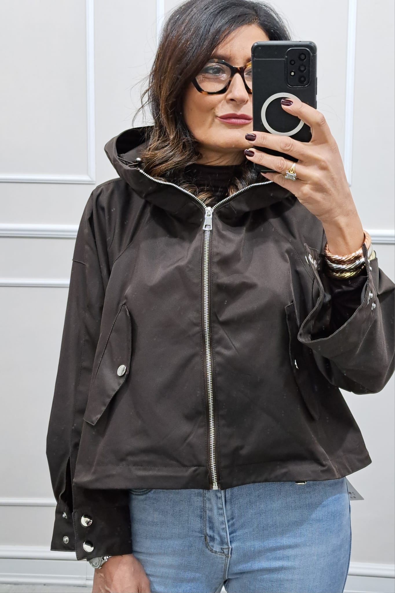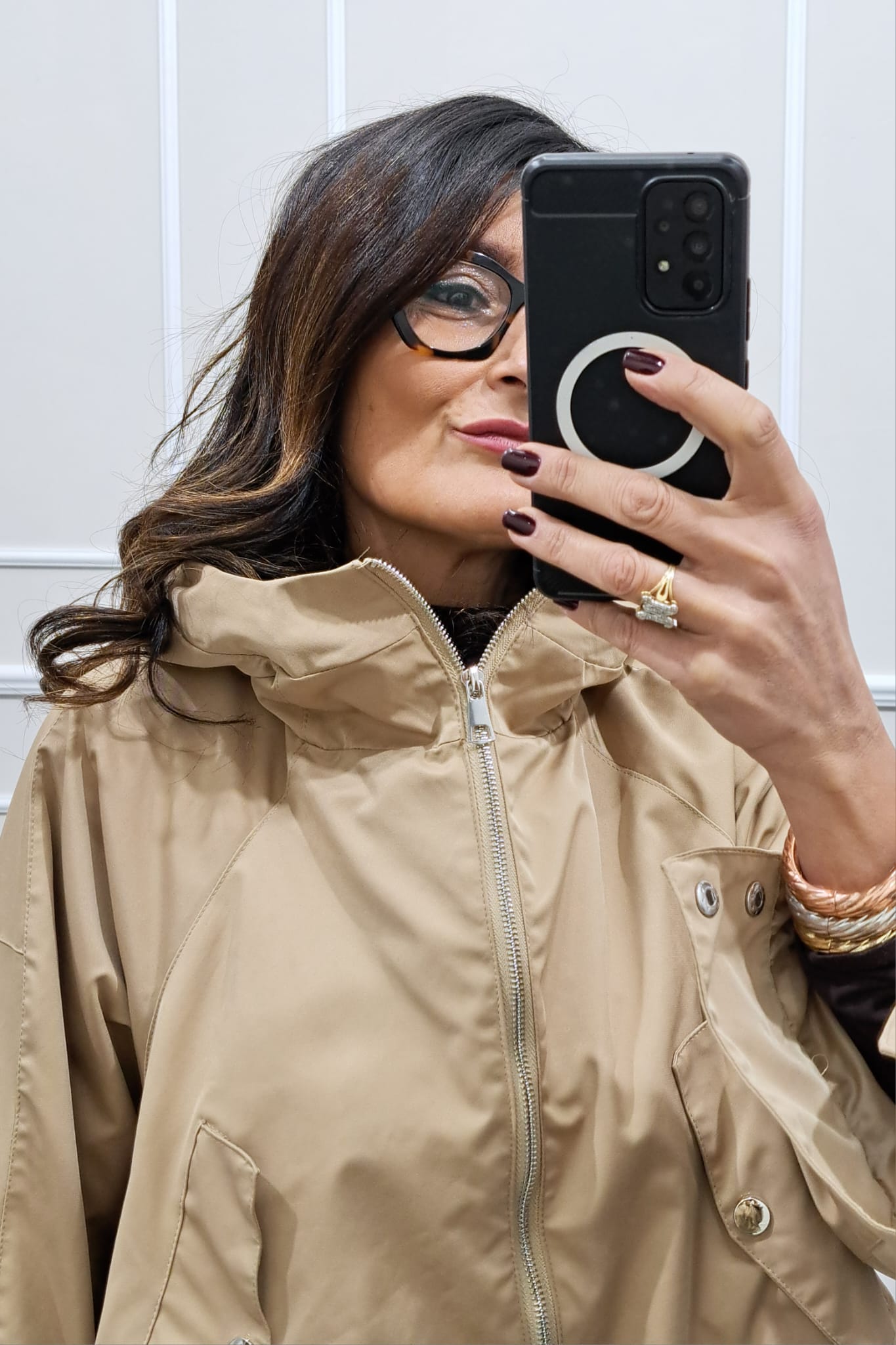 Chiusura con zip cappuccio non removibile, tashe laterali, la modella è alta 170cm