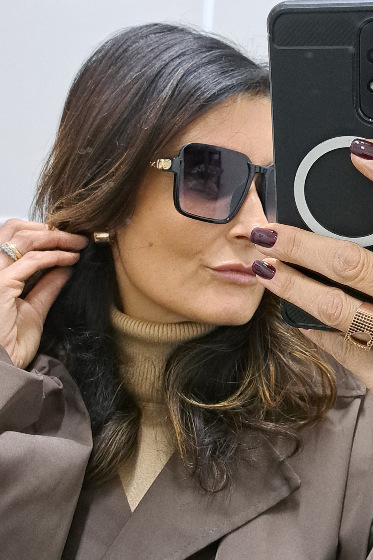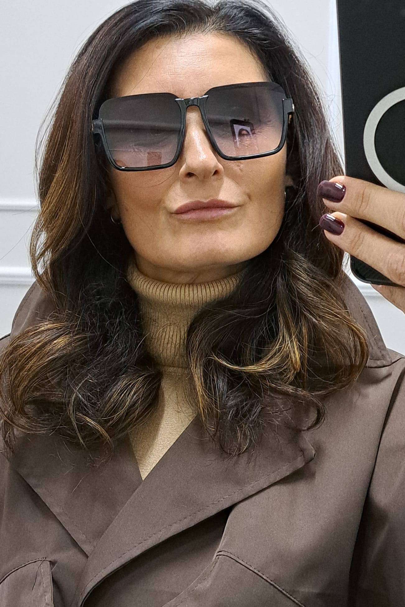 Questo occhiale da sole ha una montatura nera spessa, decisa, con una forma squadrata oversize che copre bene lo sguardo e dà un forte impatto visivo. Il design è strutturato e moderno, con linee nette e un ponte centrale marcato che rafforza lo stile audace.