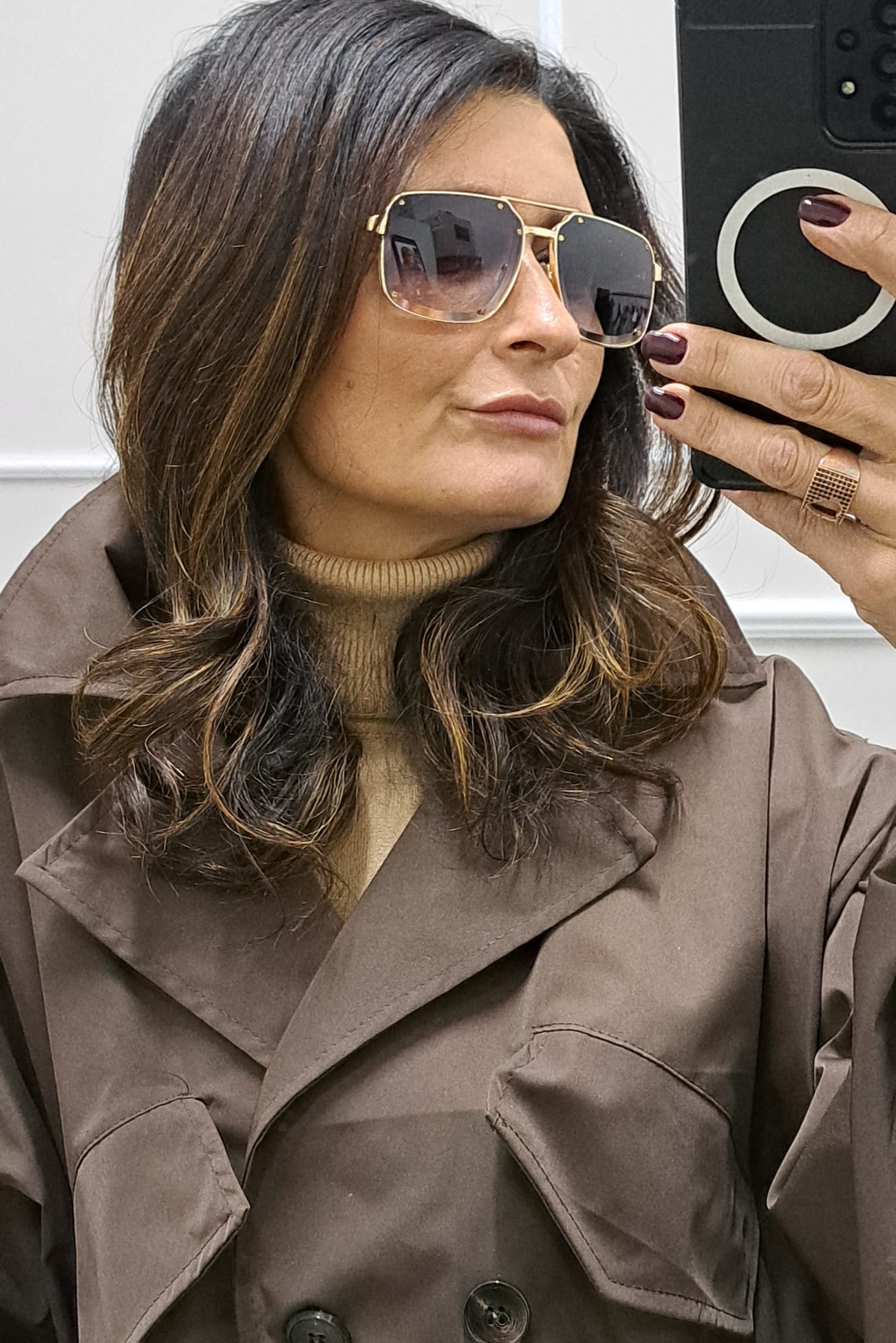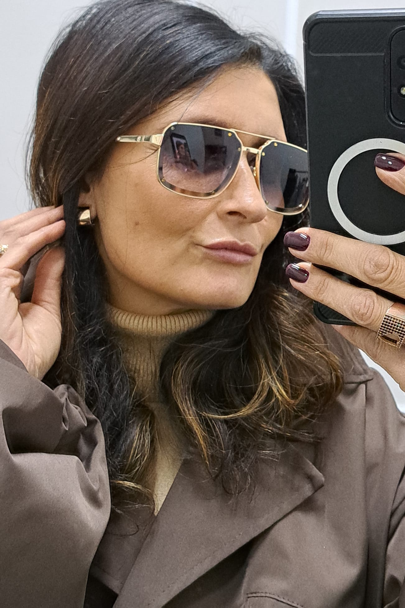 Le lenti sono scure con una sfumatura (più chiara verso il basso), dettaglio che li rende raffinati e molto chic. Il ponte è sottile e discreto, mentre le aste dorate aggiungono un tocco luminoso e curato.