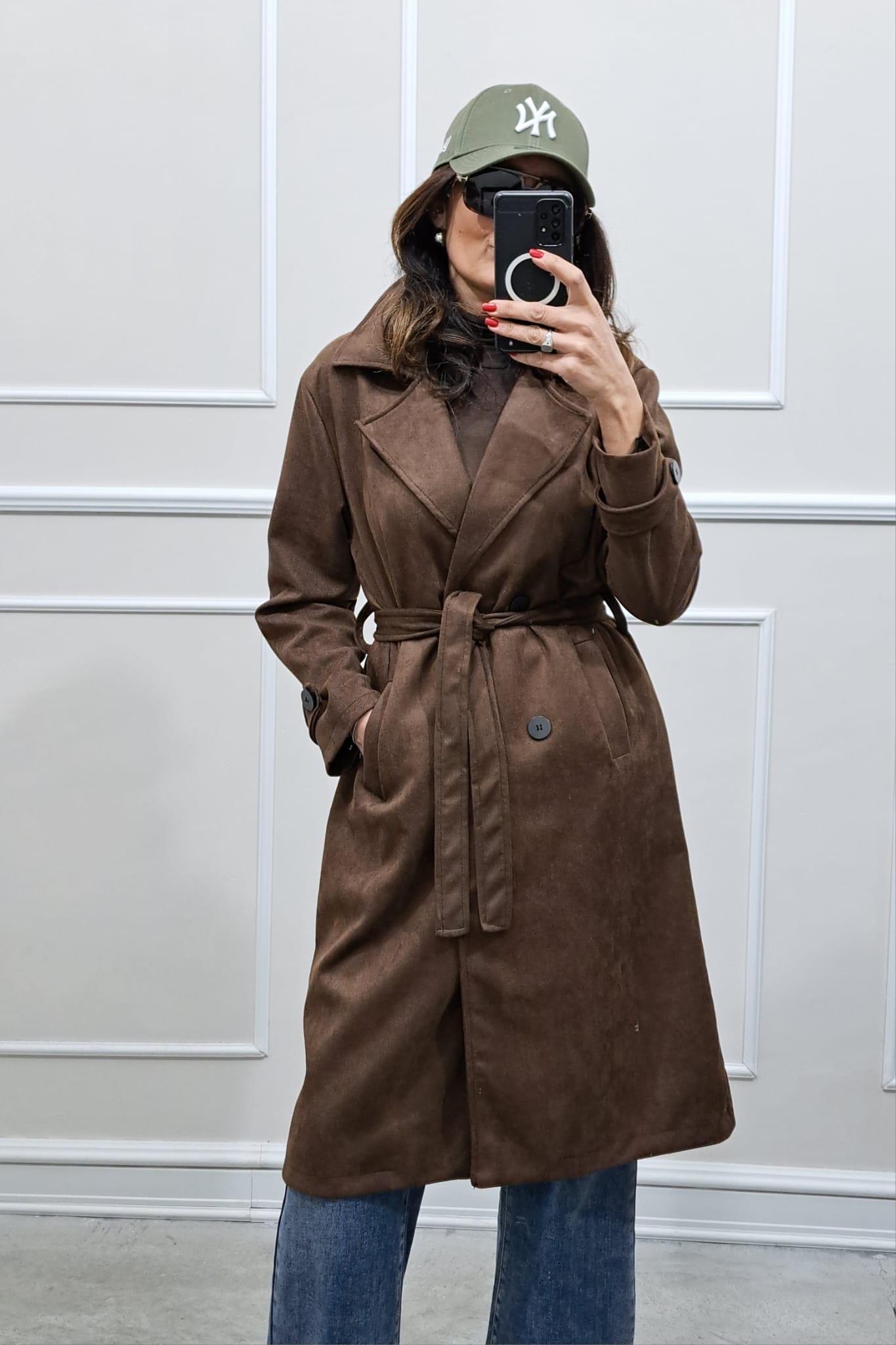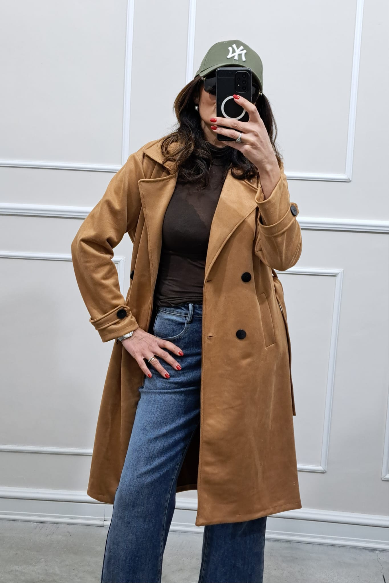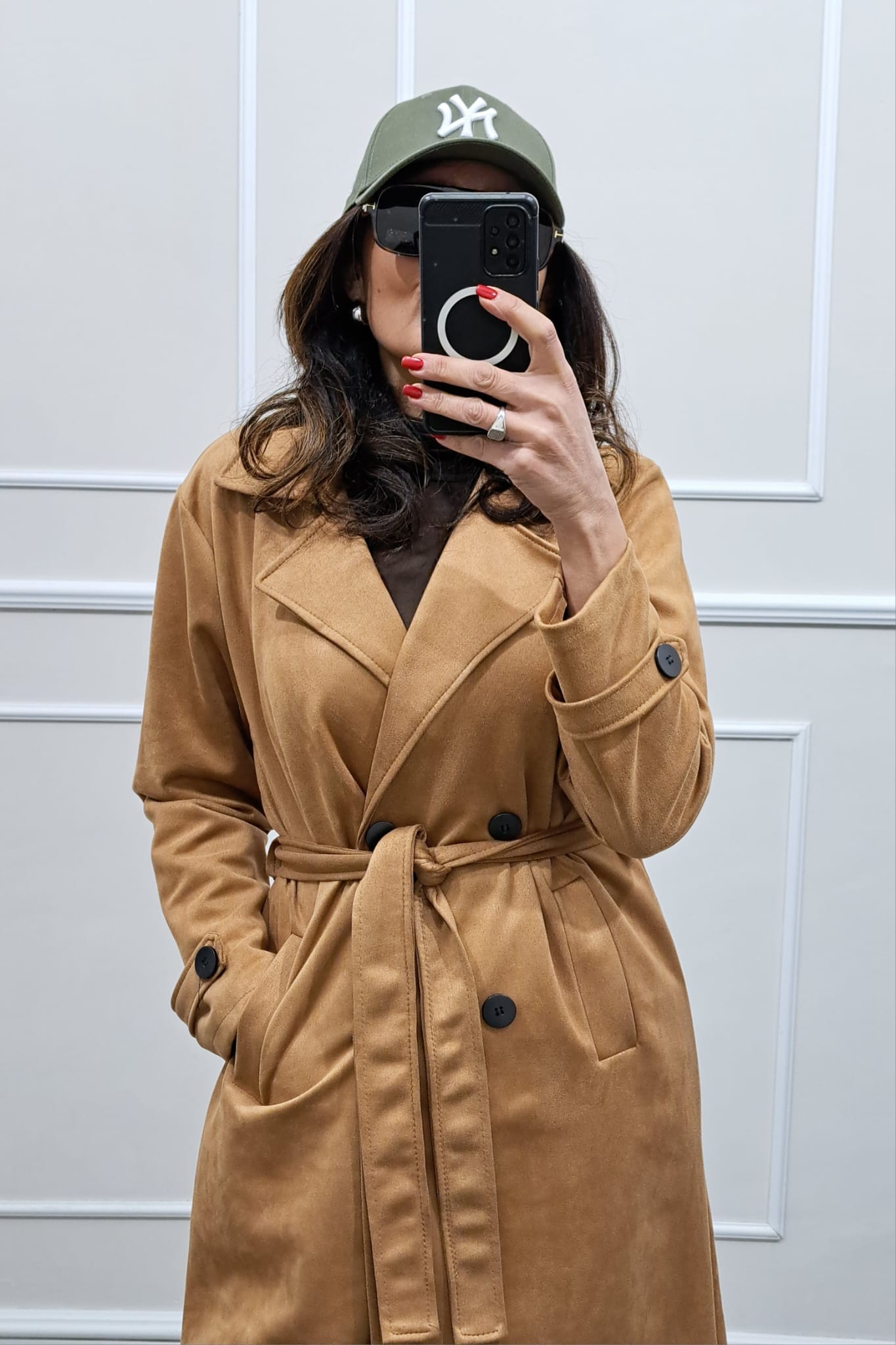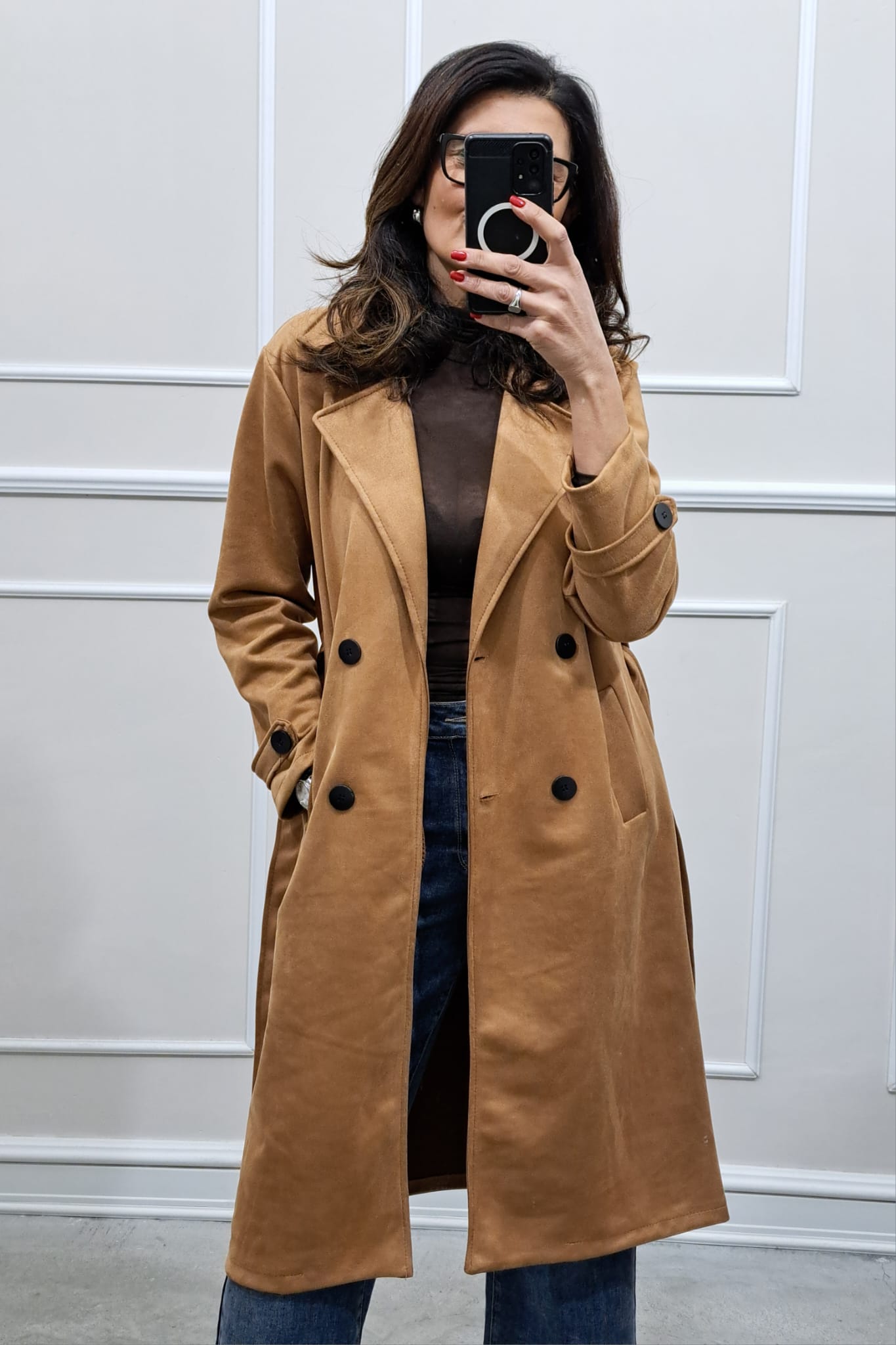 Trench scamosciato doppiopetto bottoni contrasto veste fino a tg 46,la modella è alta 170cm, perfetto anche sopra i tailleur