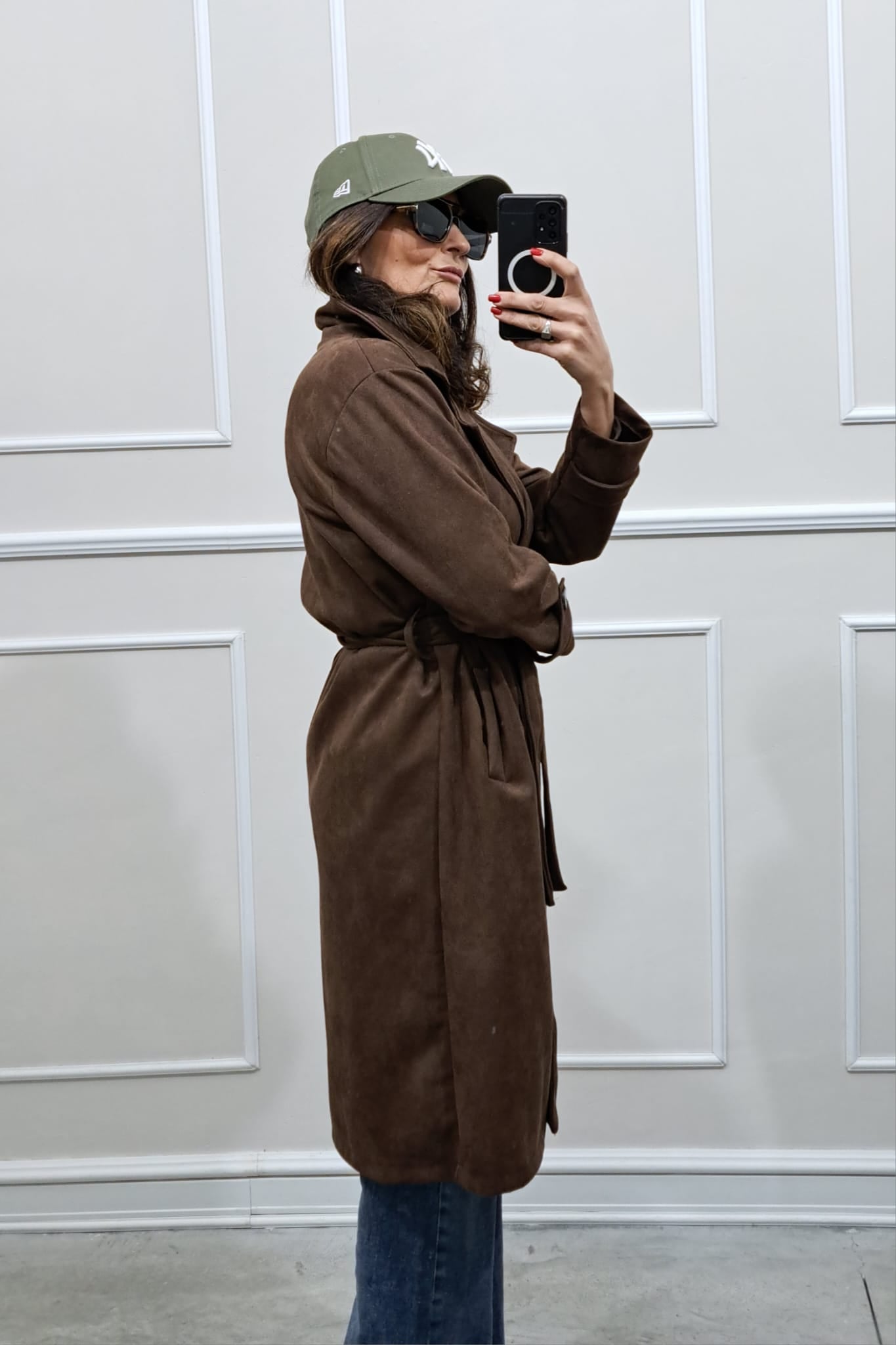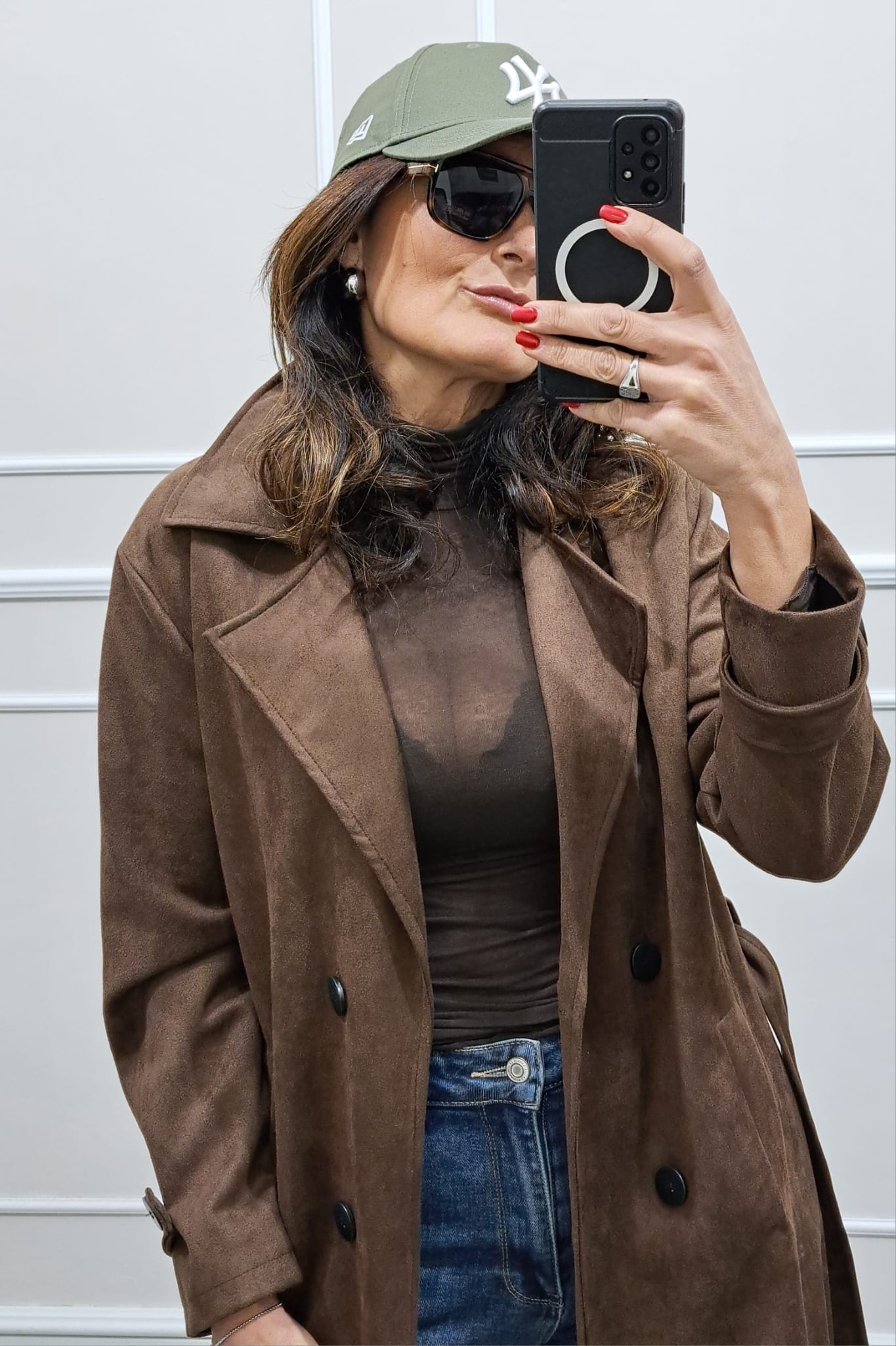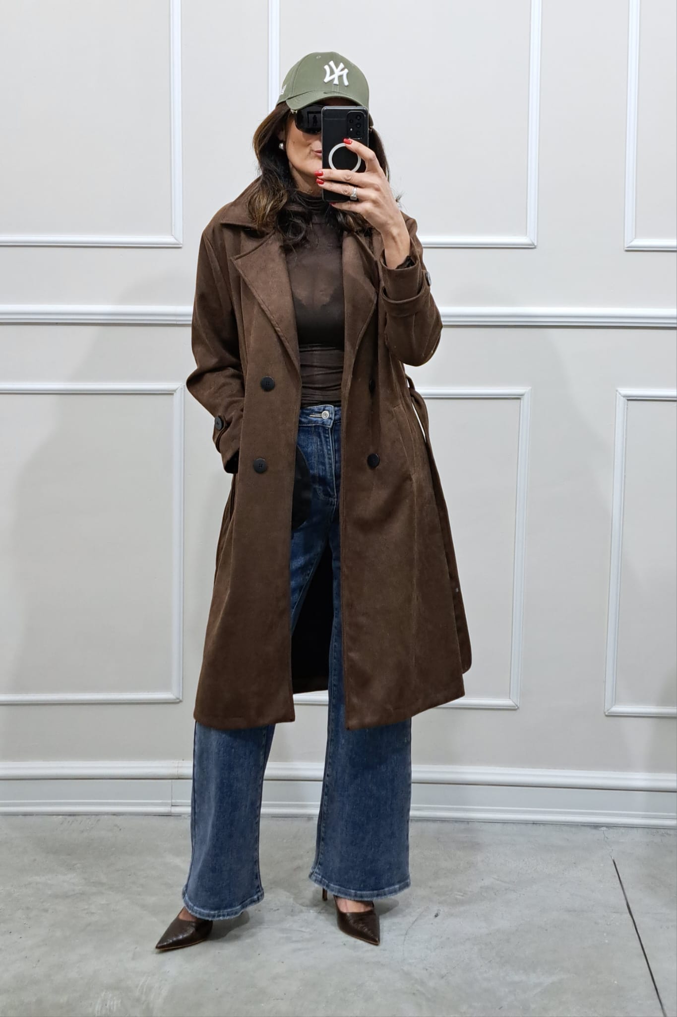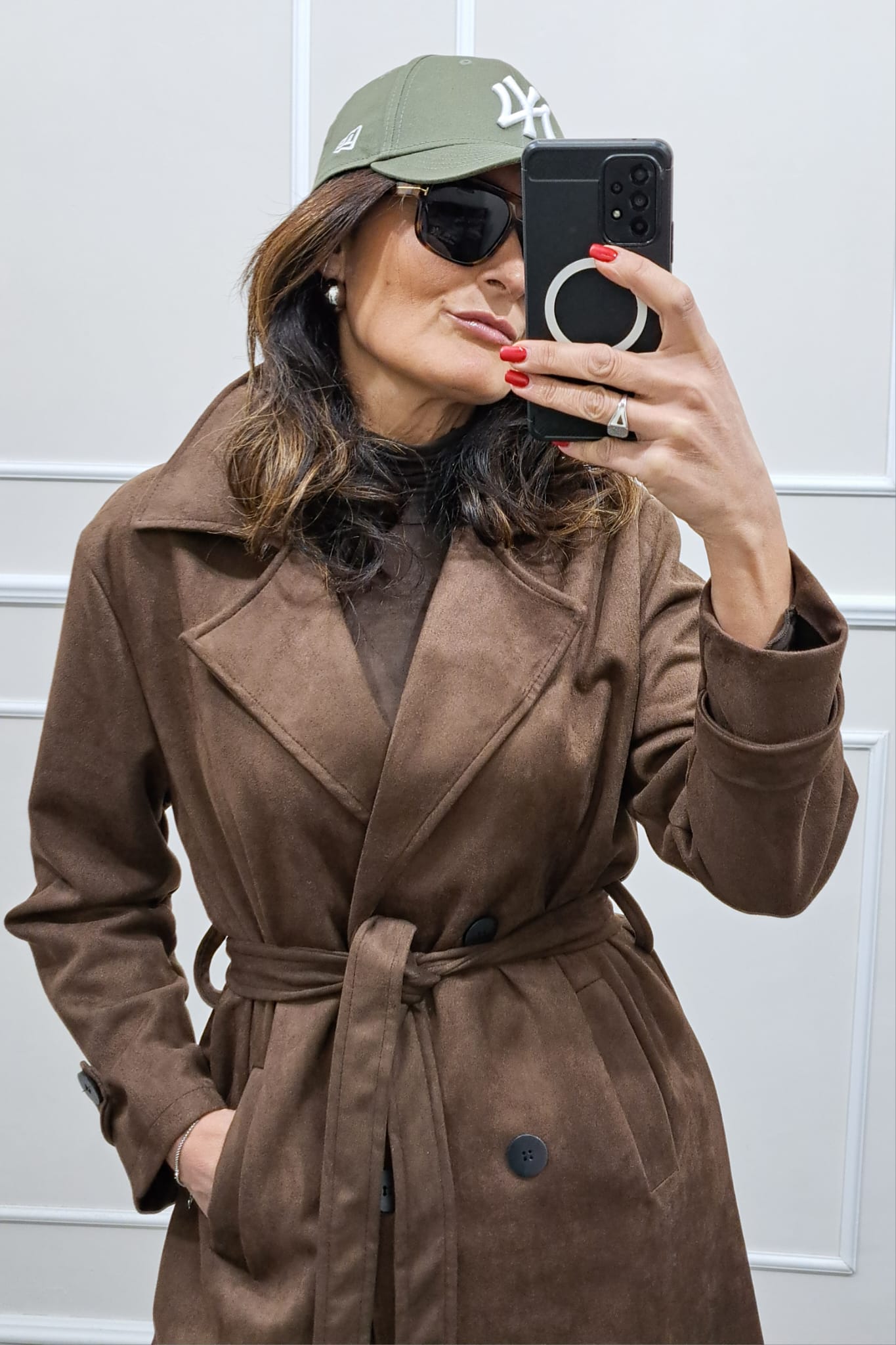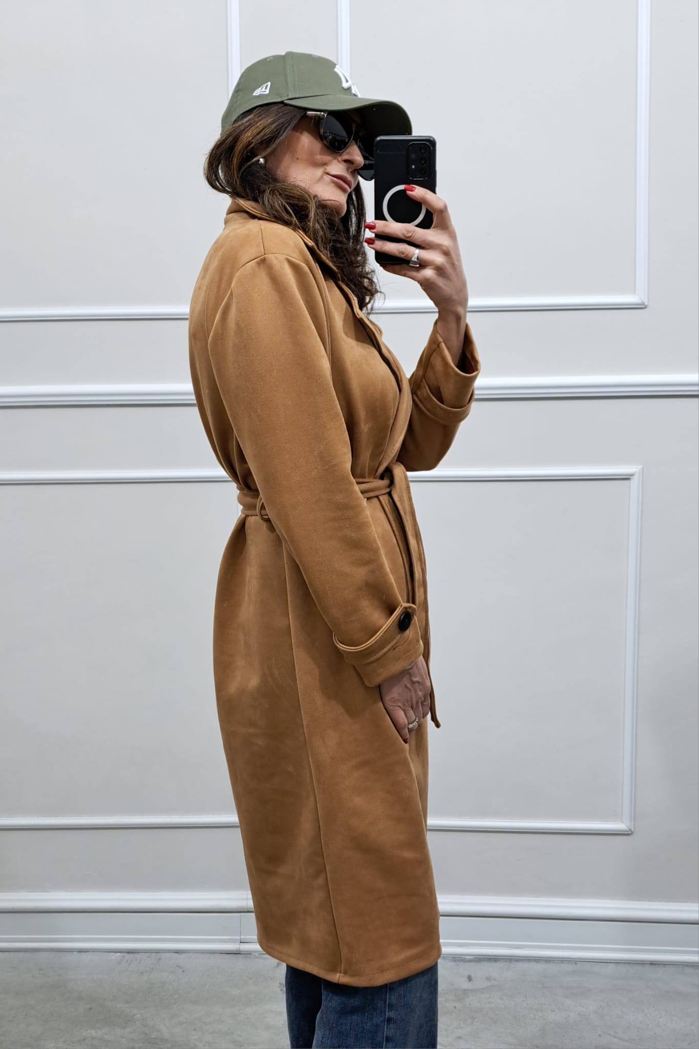 Trench scamosciato doppiopetto bottoni contrasto veste fino a tg 46,la modella è alta 170cm, perfetto anche sopra i tailleur