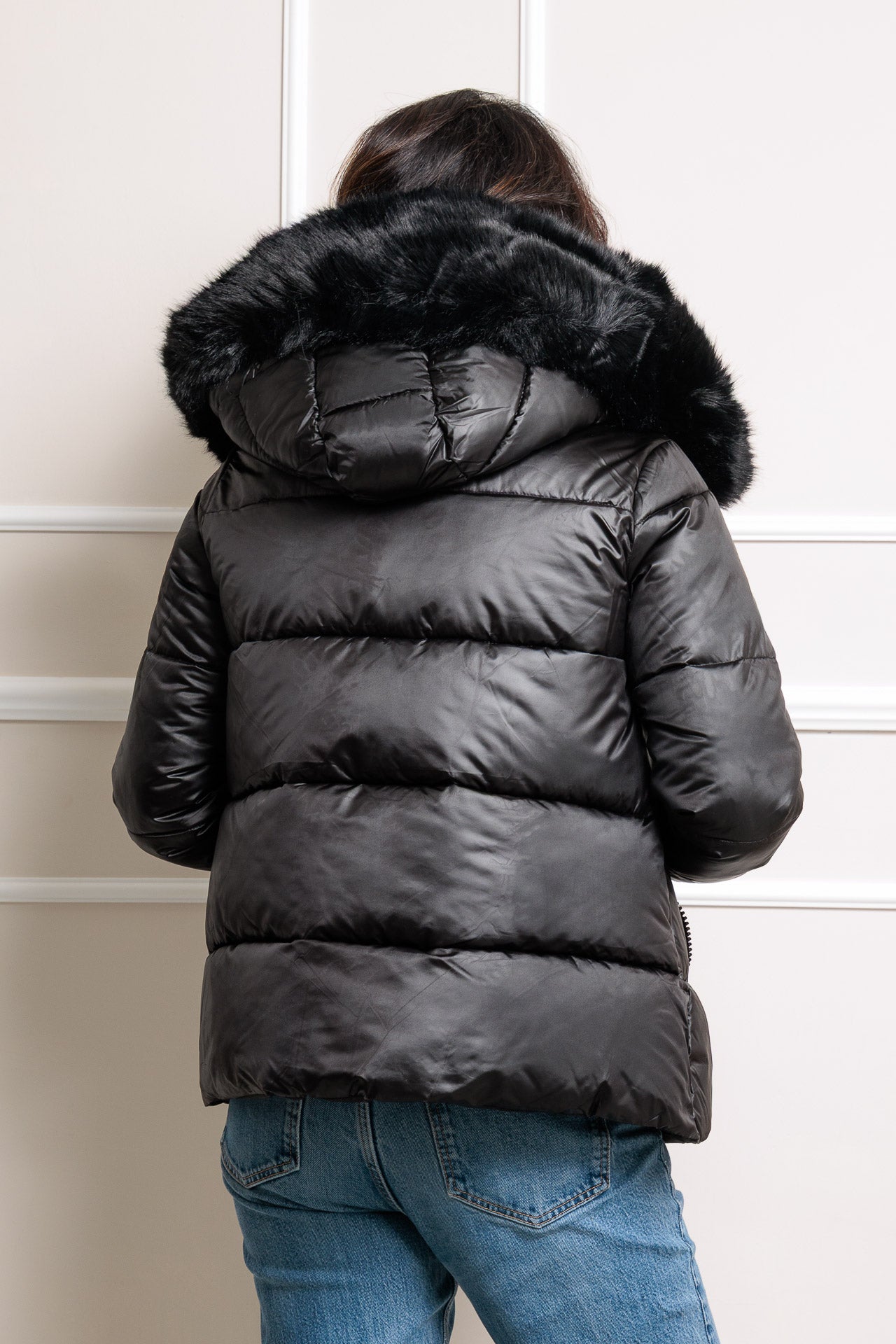 Piumino effetto satinato cappuccio avvolgente con bordo in ecopelliccia non rimovibile vestibilità regular, la persona in foto indossa una TG s ed è alta 170